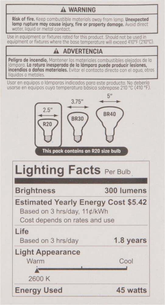 Brightness Quantity: 300 lumens. Energy Info: $5.42 based on 3 hours/day, 11 cents/kWh. Cost depends on rates and use. 45 watts. Package Info: 1. Bulb Info: Indoor. Is Flood Light. Screw. Bulb Life: 1…