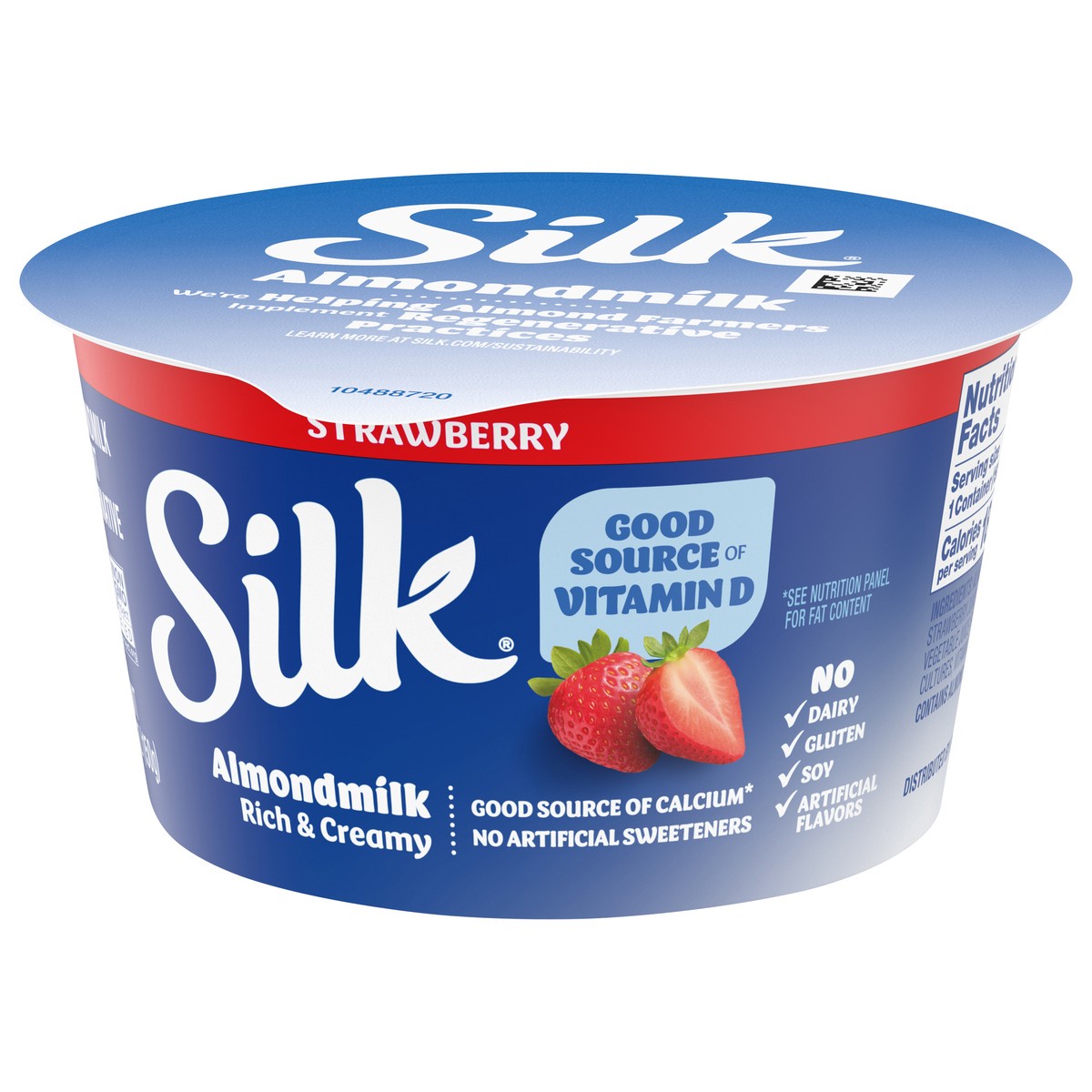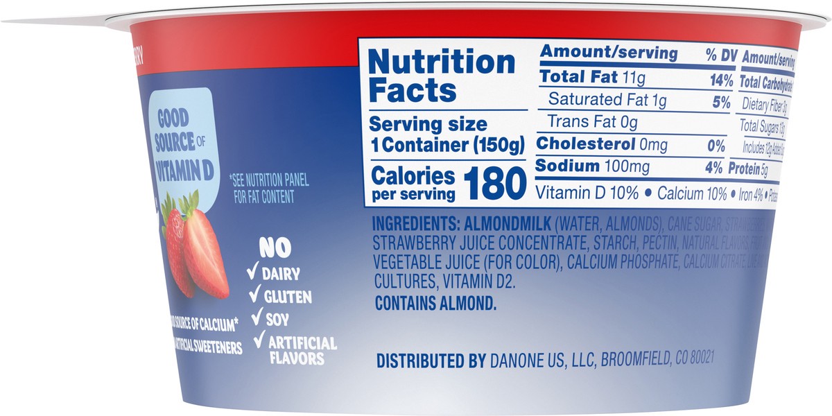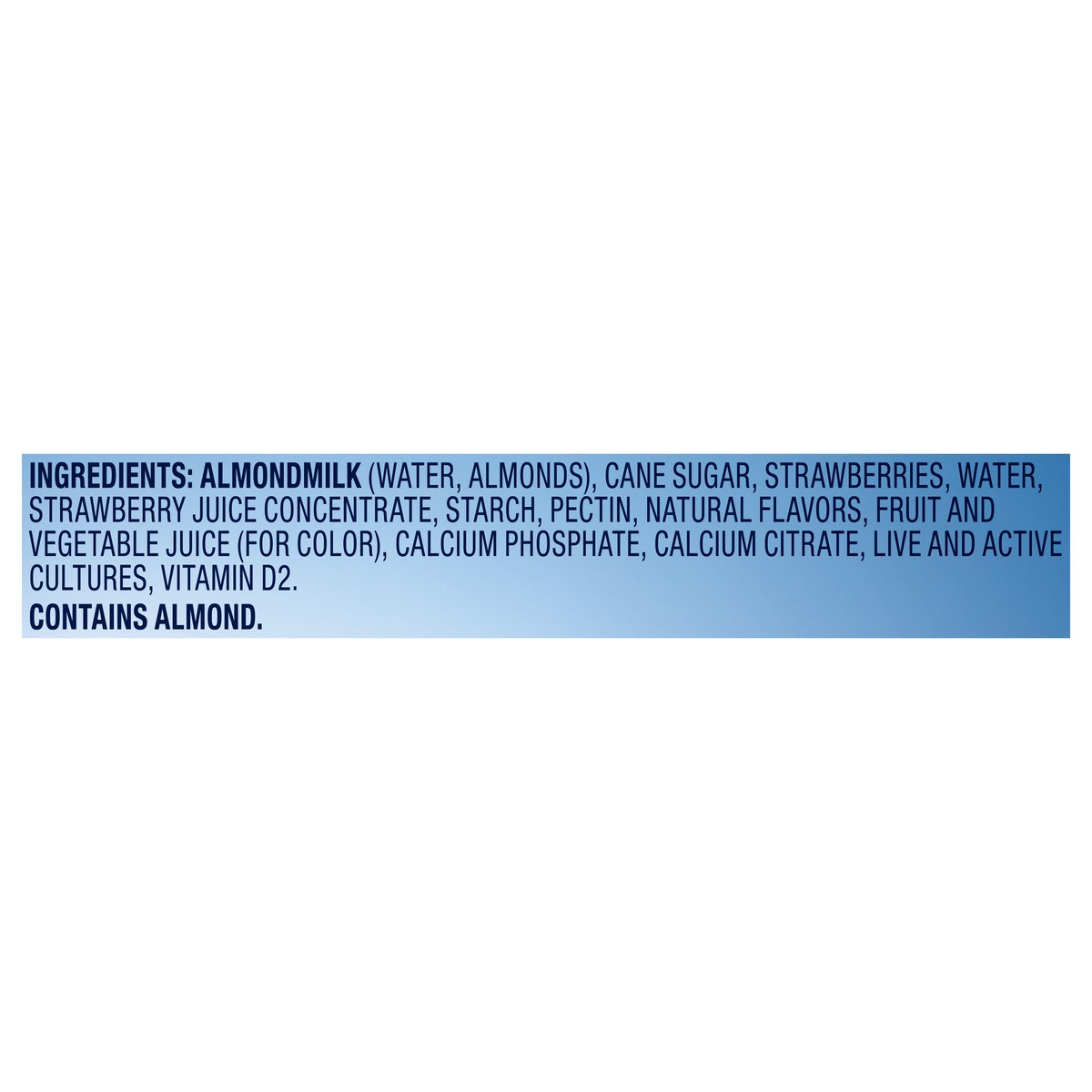 INGREDIENTS: ALMONDMILK (FILTERED WATER; ALMONDS); CANE SUGAR; STRAWBERRIES; WATER; STRAWBERRY JUICE CONCENTRATE; STARCH; PECTIN; NATURAL FLAVORS; FRUIT AND VEGETABLE JUICE (FOR COLOR); CALCIUM PHOSPH…