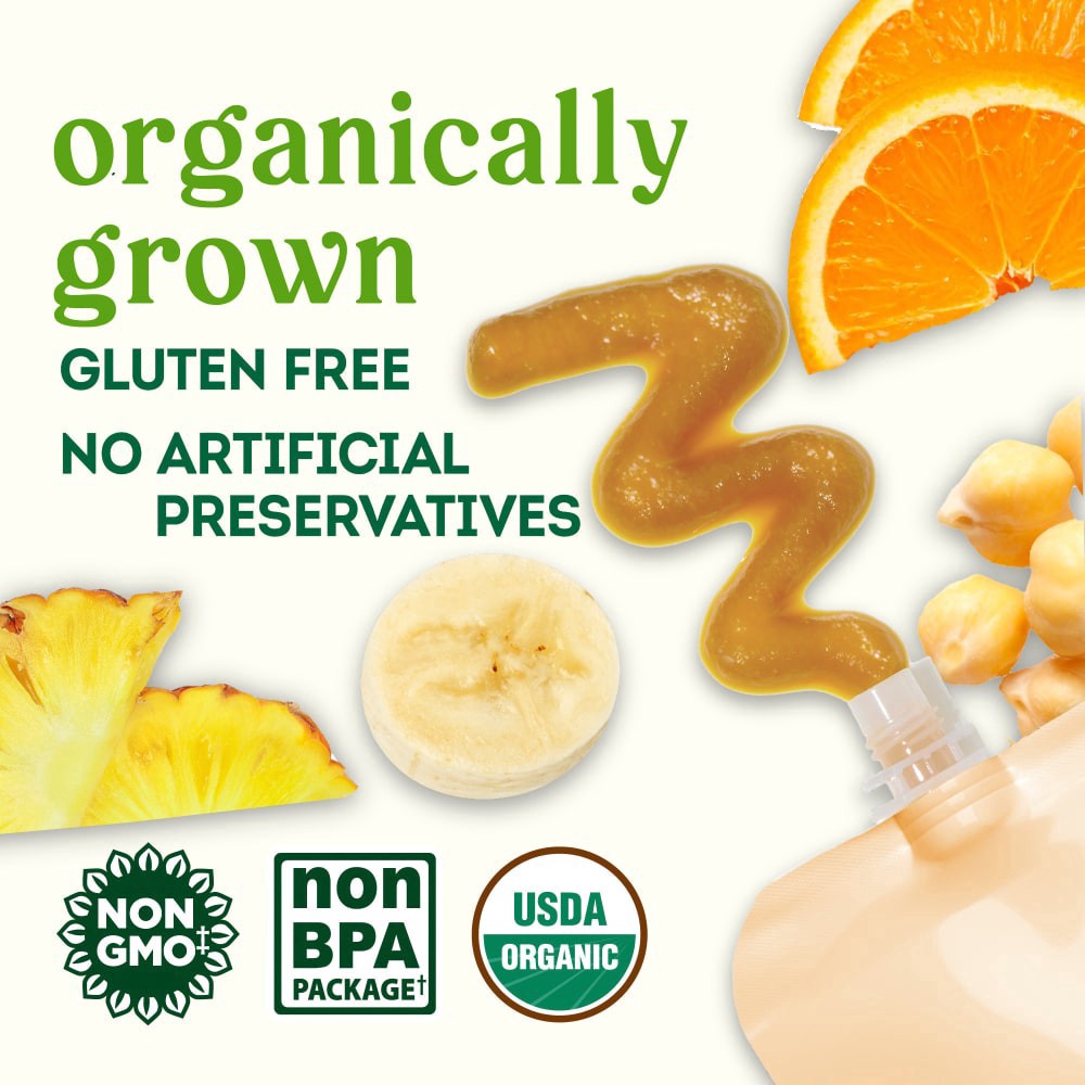 Ingredients: Organic Banana Puree, Organic Orange Juice Concentrate, Organic Pineapple Puree, Organic Chickpea Puree, Organic Lemon Juice Concentrate.