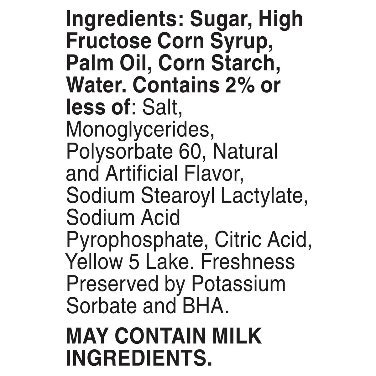 Sugar, High Fructose Corn Syrup, Palm Oil, Corn Starch, Water, Contains 2% or Less of: Salt, Monoglycerides, Polysorbate 60, Natural and Artificial Flavor, Sodium Stearoyl Lactylate, Sodium Acid Pyrop…