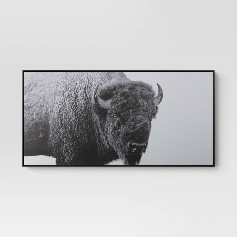 Uplift your interiors and walls with the 47"x24" Buffalo Wall Canvas Black from Threshold™. Measuring 47"x24", this striking black-and-white digital artwork captures the majestic presence of a buffalo…