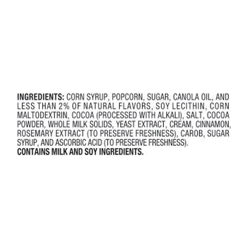 Corn Syrup, Popcorn, Sugar, Canola Oil, and Less than 2% of Natural Flavors, Soy Lecithin, Corn Maltodextrin, Cocoa (Processed with Alkali), Salt, Cocoa Powder, Whole Milk Solids, Yeast Extract, Cream…
