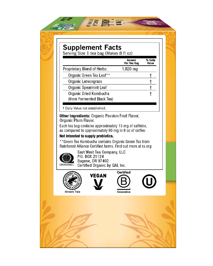 Organic Green Tea Leaf**, Organic Lemongrass, Organic Spearmint Leaf, Organic Passion Fruit Flavor, Organic Plum Flavor, Organic Dried Kombucha (from Fermented Black Tea).