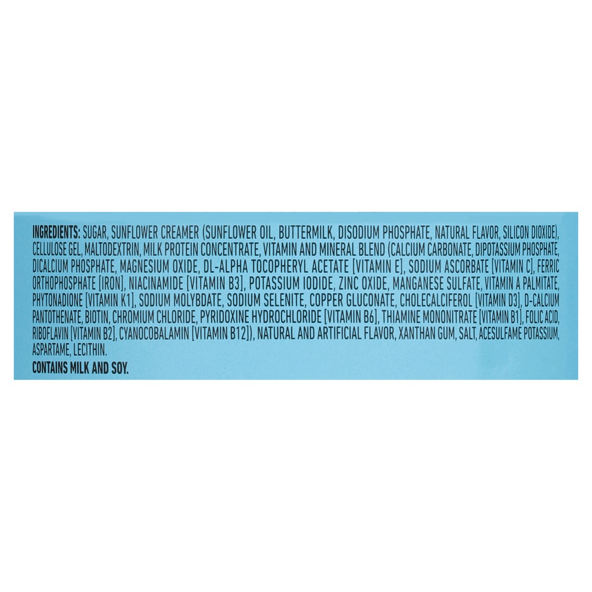 Sugar, Sunflower Creamer (Sunflower Oil, Buttermilk, Disodium Phosphate, Natural Flavor, Silicon Dioxide), Cellulose Gel, Maltodextrin, Milk Protein Concentrate, Vitamin and Mineral Blend (Calcium Car…