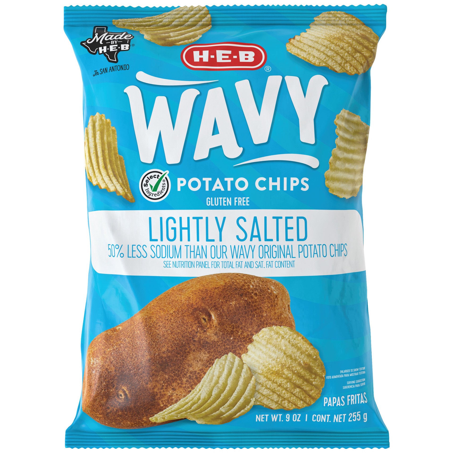 Boasting 50% less sodium* than our regular version, H-E-B lightly salted wavy potato chips are a munchy-crunchy option, especially if you're watching your salt intake. And with no artificial flavors o…