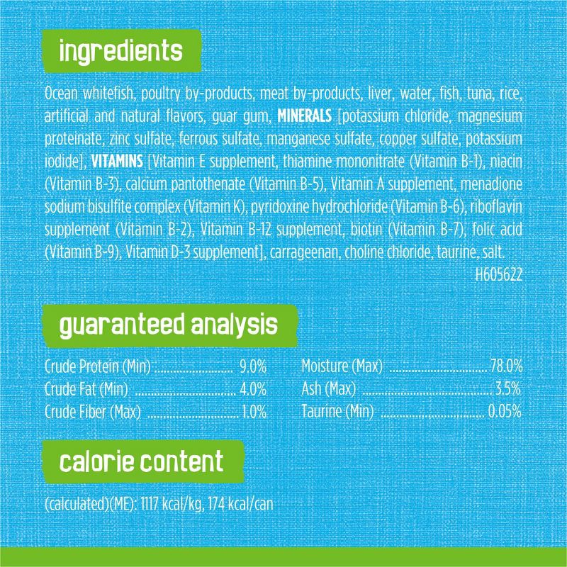 Ocean Whitefish, Poultry By-Products, Meat By-Products, Liver, Water, Fish, Tuna, Rice, Artificial and Natural Flavors, Added Color, Guar Gum, Potassium Chloride, Carrageenan, Choline Chloride, Vitami…