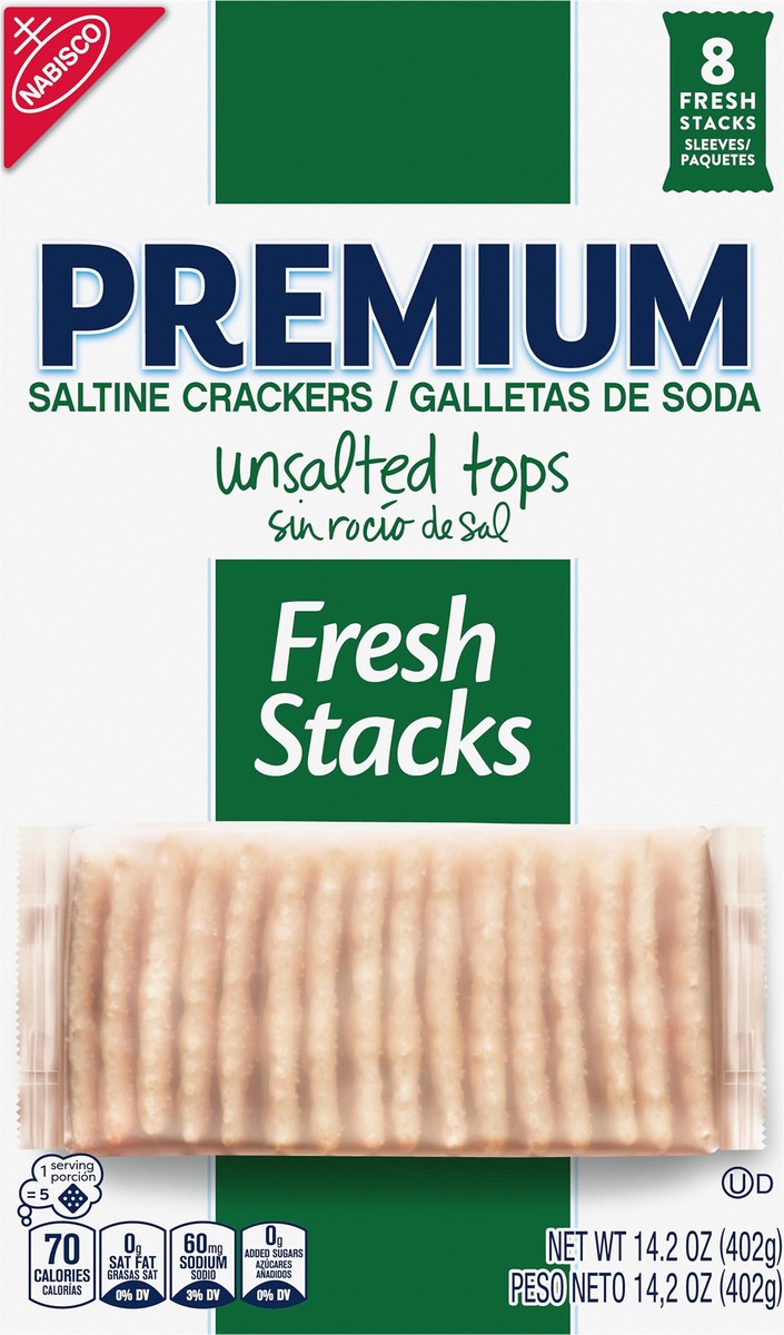 Premium Fresh Stacks Unsalted Tops Saltine Crackers are tasty Premium saltines, only without the salt on top. These soda crackers deliver classic mild flavor and crispy texture, making them a deliciou…