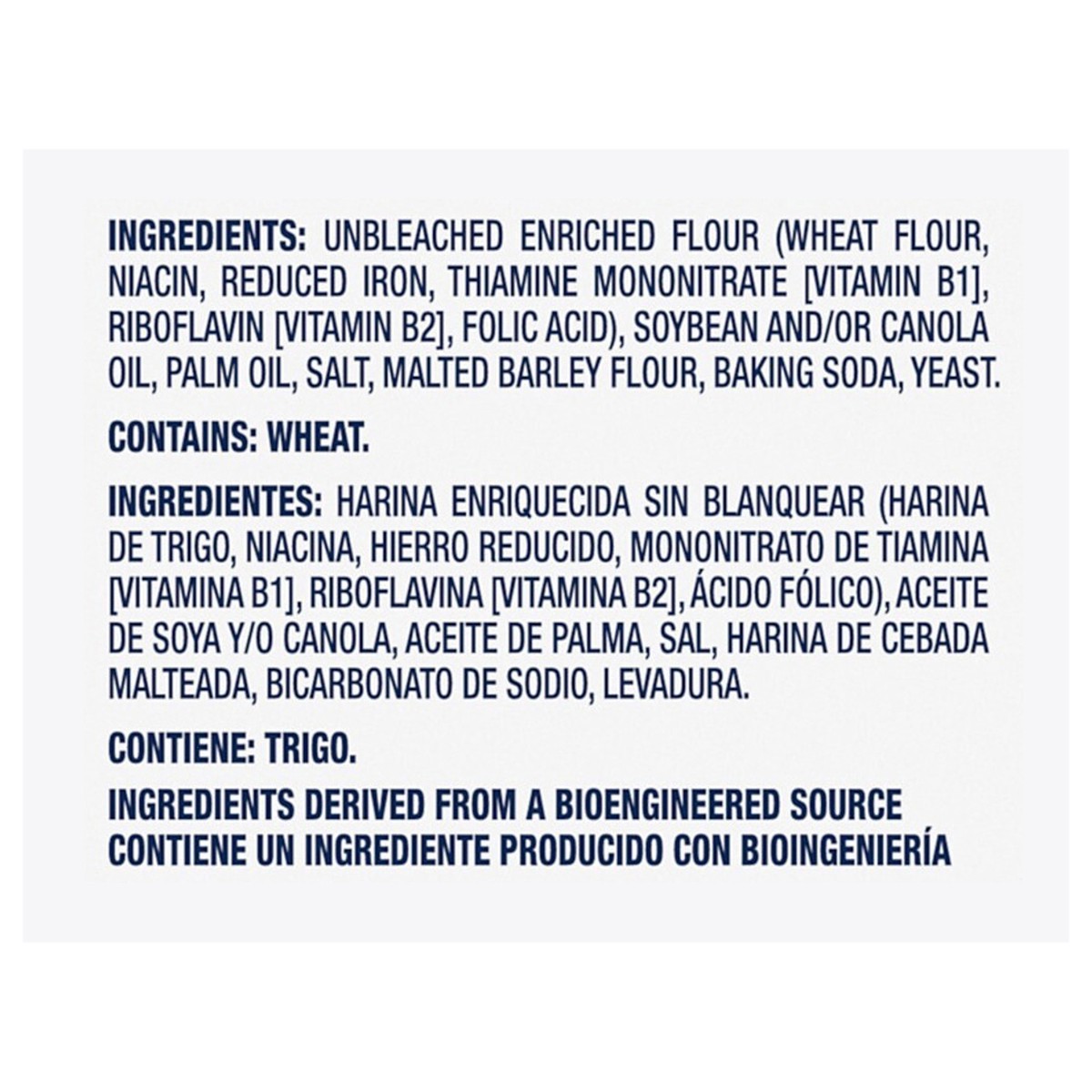 Unbleached Enriched Flour (Wheat Flour, Niacin, Reduced Iron, Thiamine Mononitrate [Vitamin B1], Riboflavin [Vitamin B2], Folic Acid), Soybean and/or Canola Oil, Palm Oil, Salt, Malted Barley Flour, B…