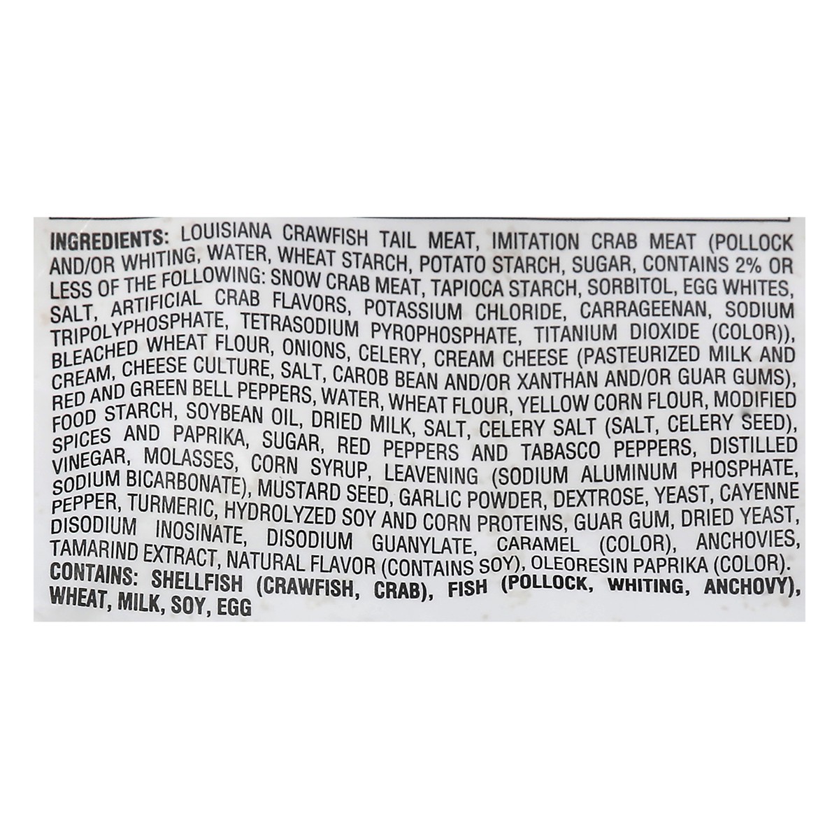 Made with real crawfish and imitation crab meat. Restaurant quality. Oven ready. Louisiana. Certified Cajun: Louisiana Crawifsh. Questions or comments call 1-800-Seafood (732-3663). Reseal for freshne…