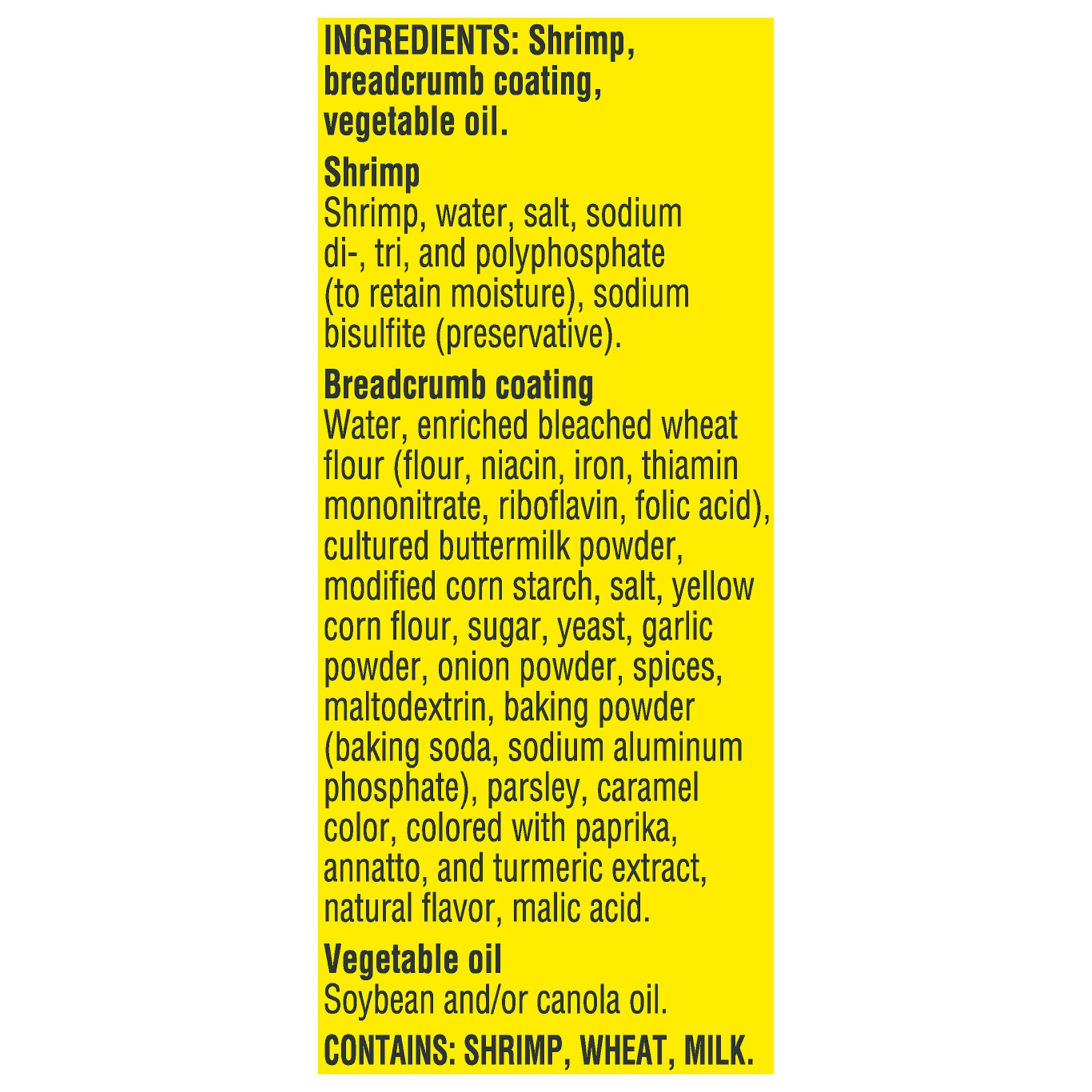 Shrimp, Breadcrumb Coating, Vegetable Oil. Shrimp: Shrimp, Water, Salt, Sodium, di-, tri-, and Polyphosphate (to Retain Moisture), Sodium Bisulfite (Preservative). Breadcrumb Coating: Water, Enriched …