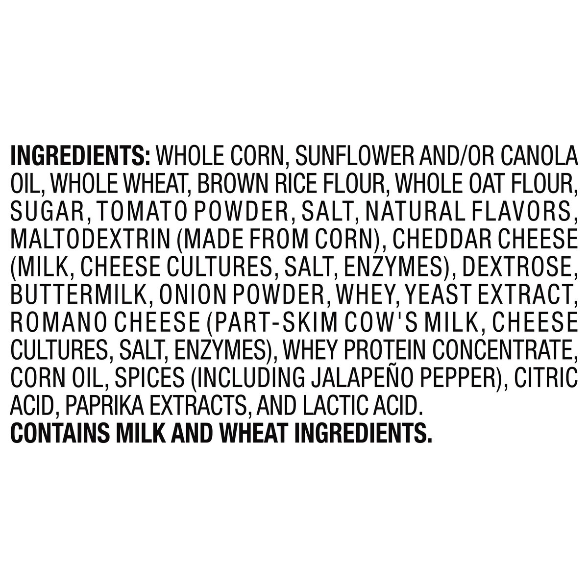 Whole Corn, Sunflower and/or Canola Oil, Whole Wheat, Brown Rice Flour, Whole Oat Flour, Sugar, Tomato Powder, Salt, Natural Flavors, Maltodextrin (Made from Corn), Cheddar Cheese (Milk, Cheese Cultur…