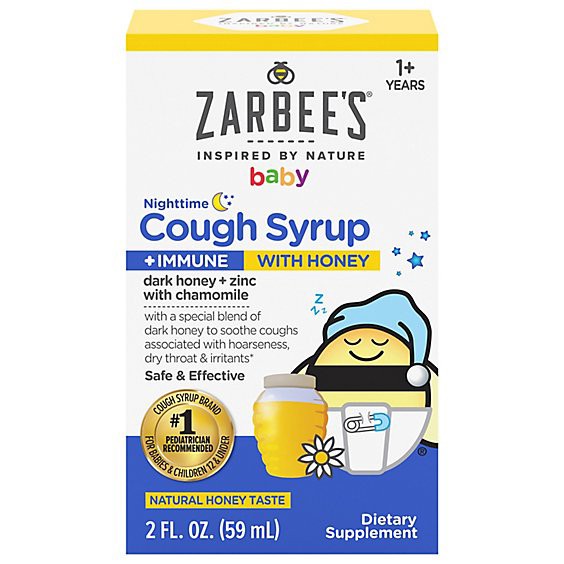 Baby Nighttime cough syrup soothes coughs**, supports the immune system & promotes relaxation before bed with clinically tested, natural dark honey, zinc & chamomile*. These cough syrups from Zarbee's…