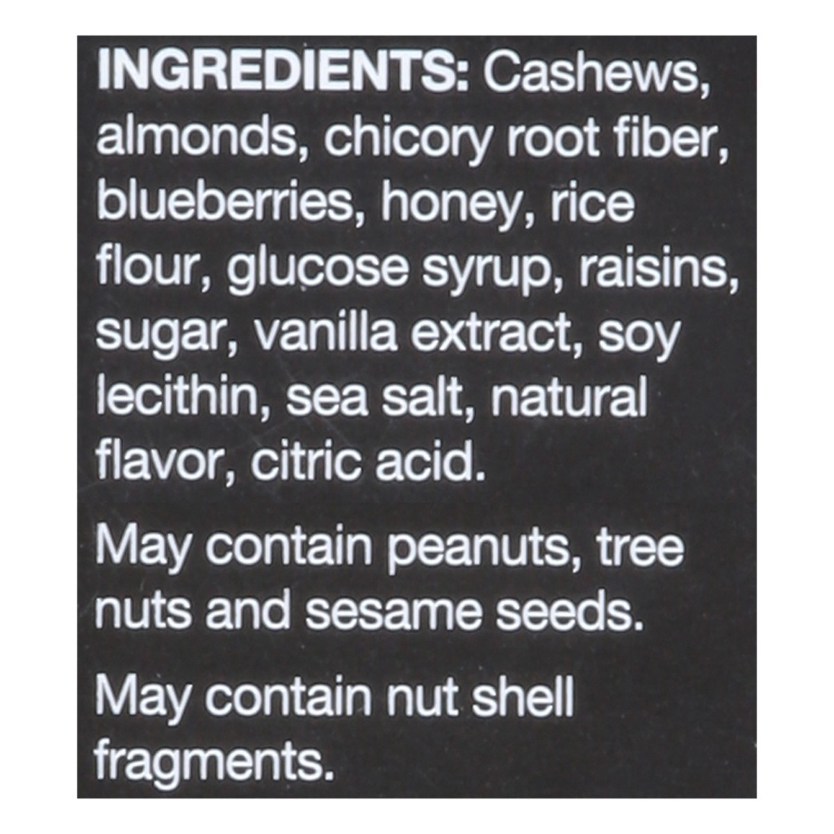 Cashews, Almonds, Chicory Root Fiber, Dried Blueberries, Glucose Syrup, Rice Flour, Honey, Raisins, Cane Sugar, Vanilla Extract, Soy Lecithin, Sea Salt, Natural Flavor, Citric Acid.