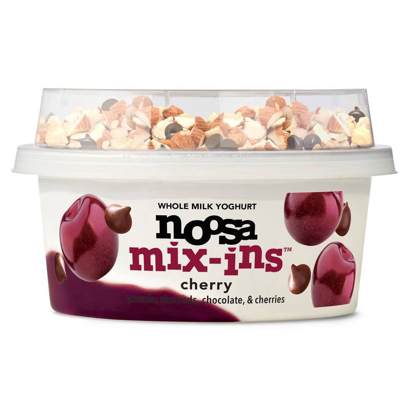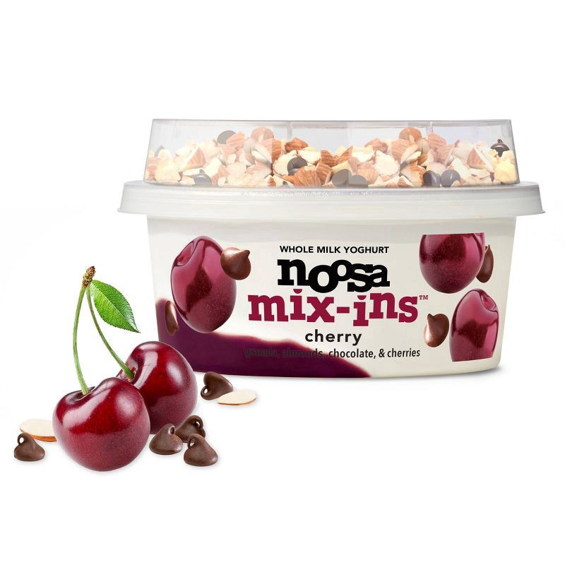 noosa cherry mix-ins yoghurt provides the ultimate 'full on' deliciousness with whole milk yogurt atop real black cherry puree with dark chocolate chips, honey oat granola, sliced roasted almonds, & d…