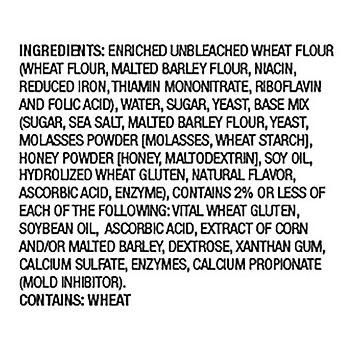 Enriched Unbleached Wheat Flour (Wheat Flour, Malted Barley Flour, Niacin, Reduced Iron, Thiamin Mononitrate, Riboflavin and Folic Acid), Water, Sugar, Yeast, Base Mix (Sugar, Sea Salt, Malted Barley …