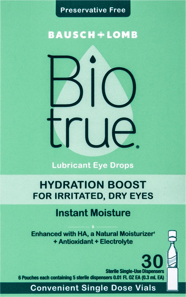 - Preservative Free Eye Drops: Biotrue Hydration Boost is preservative free and enhanced with HA (Hyaluronan). Biotrue Hydration Boost moisturizing eye drops are designed to mimic natural tears to deliver long-lasting hydration and comfort for dry