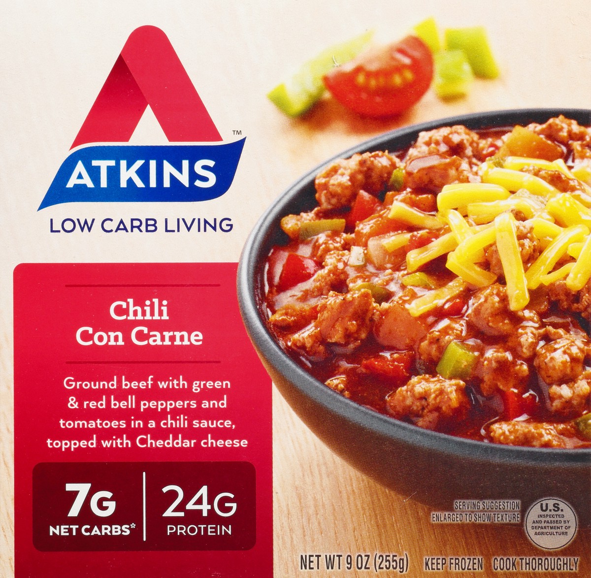 Ground beef with green & red bell peppers and tomatoes in a chili sauce, topped with cheddar cheese. 7g net carbs (Counting carbs? Atkins net carb count assists you in tracking carbs that impact blood…