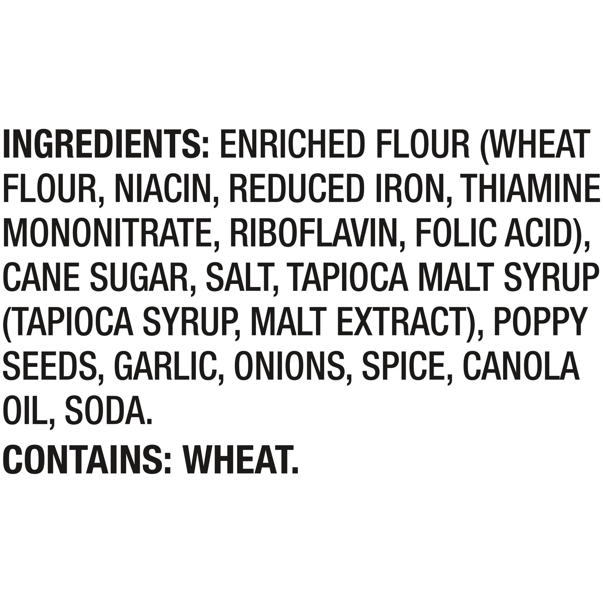 INGREDIENTS: ENRICHED FLOUR (WHEAT FLOUR, NIACIN, REDUCED IRON, THIAMINE MONONITRATE, RIBOFLAVIN, FOLIC ACID), CANE SUGAR, SALT, TAPIOCA MALT SYRUP (TAPIOCA SYRUP, MALT EXTRACT), POPPY SEEDS, GARLIC, …