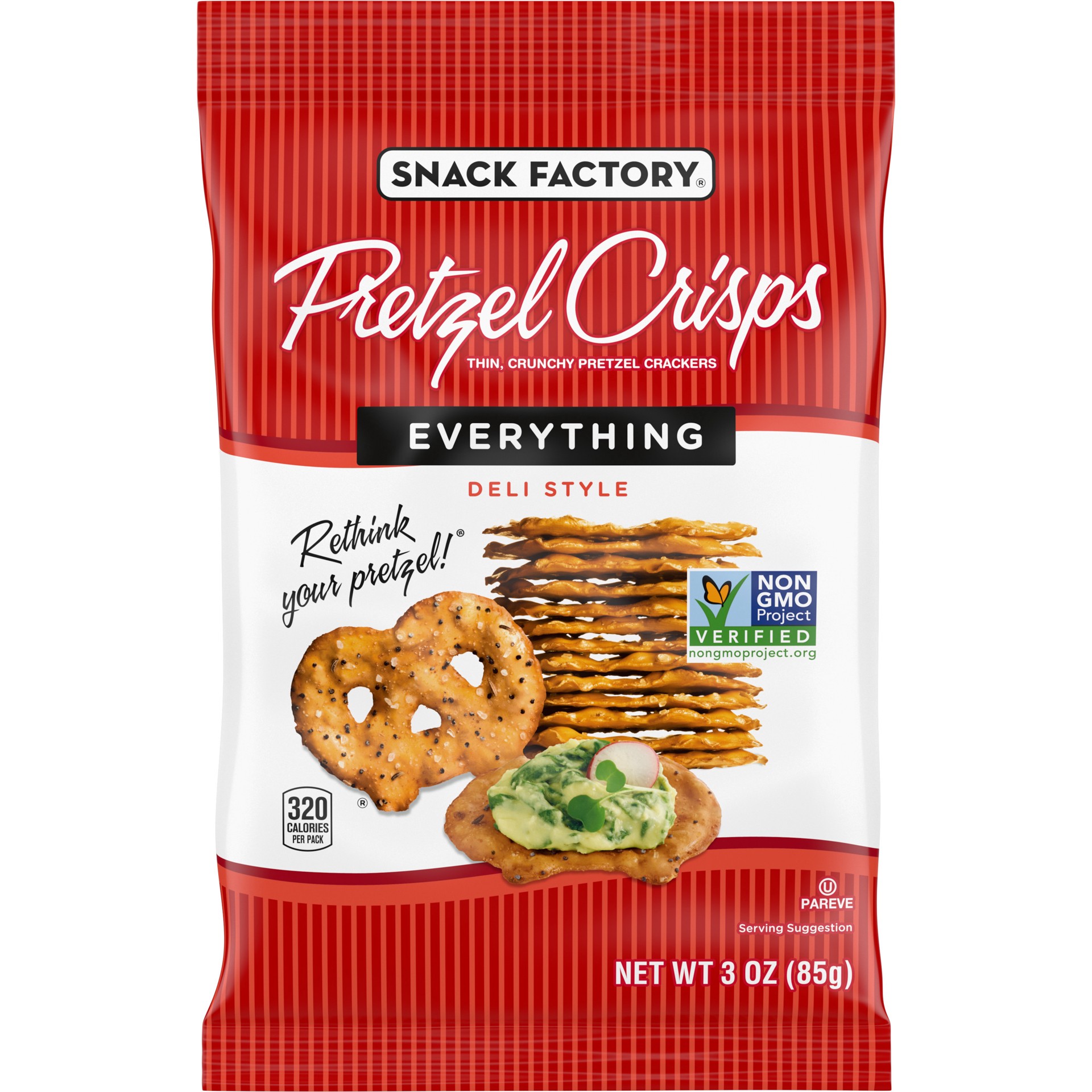 Snack Factory Everything Pretzel Crisps are a modern twist on two old favorites – pretzels and bagels. Made with quality ingredients and baked up thin and crunchy, they’re sprinkled generously with po…