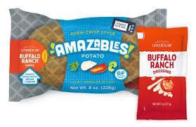 Oven-crispy potato skin on the outside, fluffy potato on the inside. Single serve russet potato accompanied by custom, gluten-free Litehouse Buffalo Ranch sauce. Cooks in 6 minutes. Packaging film is …