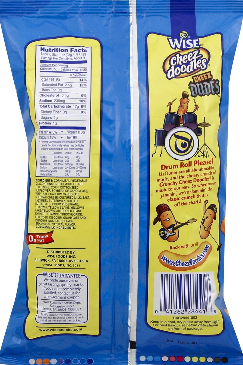 Crunchy cheese flavored corn snacks. Classic American snacks. Since 1921. Made with real cheese. 0 g trans fat. Cheez Dudes. Drum roll please! Us Dudes are all about makin' music, and the cheesy crunc…