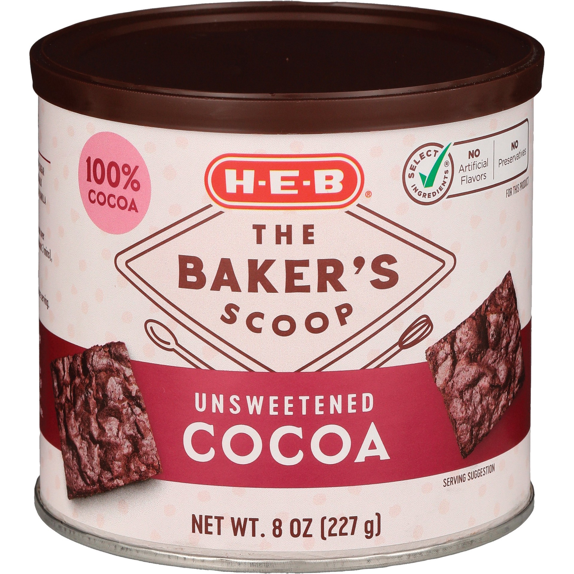 Handy for baking or making marshmallow-topped mugs of hot chocolate, H-E-B The Baker's Scoop unsweetened cocoa is dark, rich and 100% cocoa. If you've run out of squares of baking chocolate and need t…