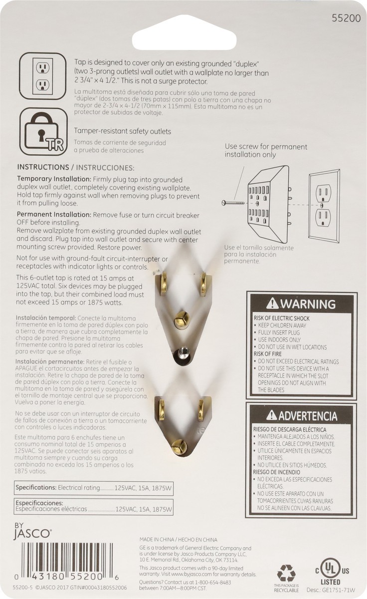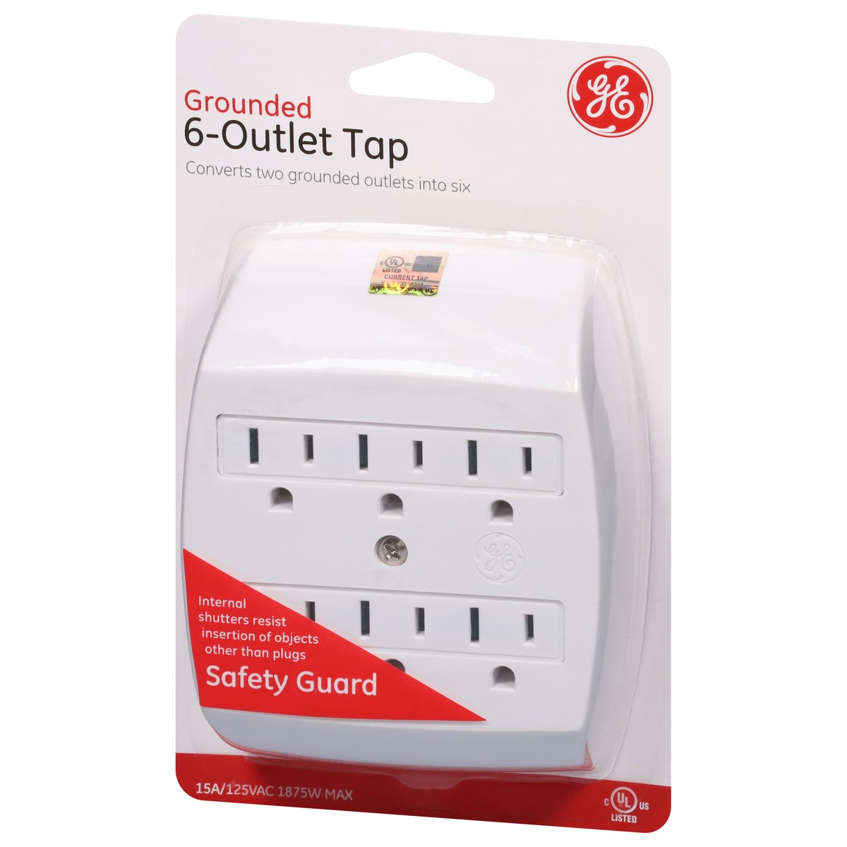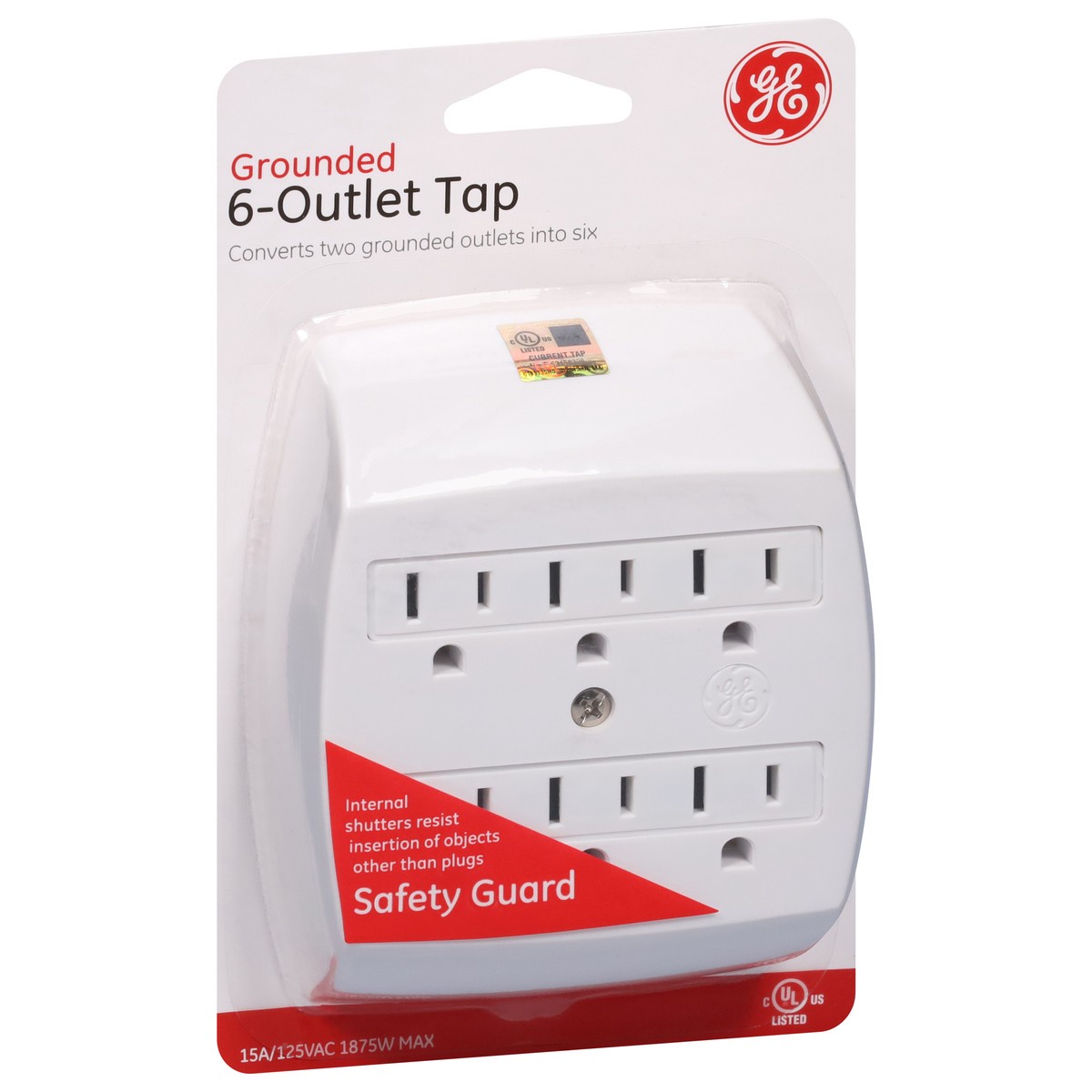 Converts two grounded outlets into six. Internal shutters resist insertion of objects other than plugs. Safety guard. Tap is designed to cover only an existing grounded duplex (two 3-prong outlets) wa…