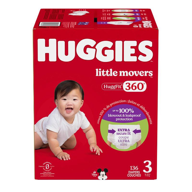 Huggies Little Movers HuggFit 360° Baby Diapers have 360° protection to help prevent leaks from any angle and an extra secure waistband designed to move with baby during play. HuggFit 360° slip-on dia…
