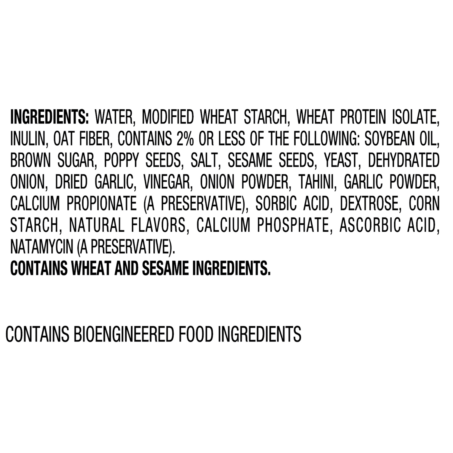 Water, Modified Wheat Starch, Wheat Protein Isolate, Inulin, Oat Fiber, Contains 2% or Less of the Following: Soybean Oil, Brown Sugar, Poppy Seeds, Salt, Sesame Seeds, Yeast, Dehydrated Onion, Dried …