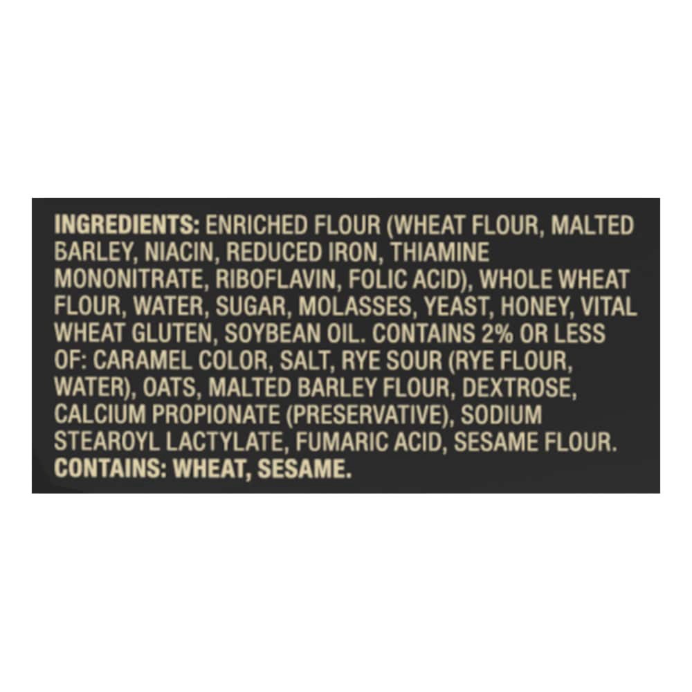 Enriched Flour (Wheat Flour, Malted Barley, Niacin, Reduced Iron, Thiamine Mononitrate, Riboflavin, Folic Acid), Whole Wheat Flour, Water, Sugar, Molasses, Yeast, Honey, Vital Wheat Gluten, Soybean Oi…
