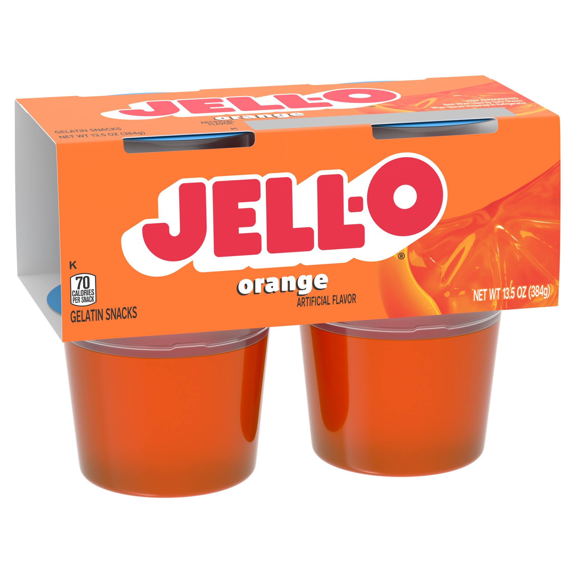 Jell-O Original Orange Artificially Flavored Ready-to-Eat Gelatin Snack Cups deliver the great taste of Jell-O Gelatin in an on-the-go cup. Our colorful, jiggly treat comes in individual snack cups, p…