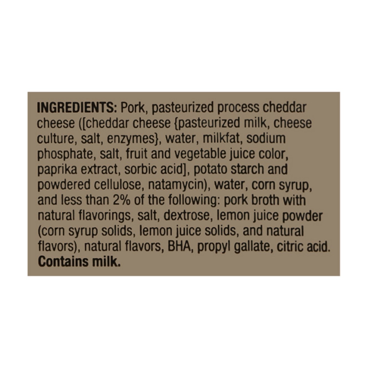 Pork, Pasteurized Process Cheddar Cheese ([Cheddar Cheese {Pasteurized Milk, Cheese Culture, Salt, Enzymes}, Water, Milkfat, Sodium Phosphate, Salt, Fruit and Vegetable Juice Color, Paprika Extract, S…