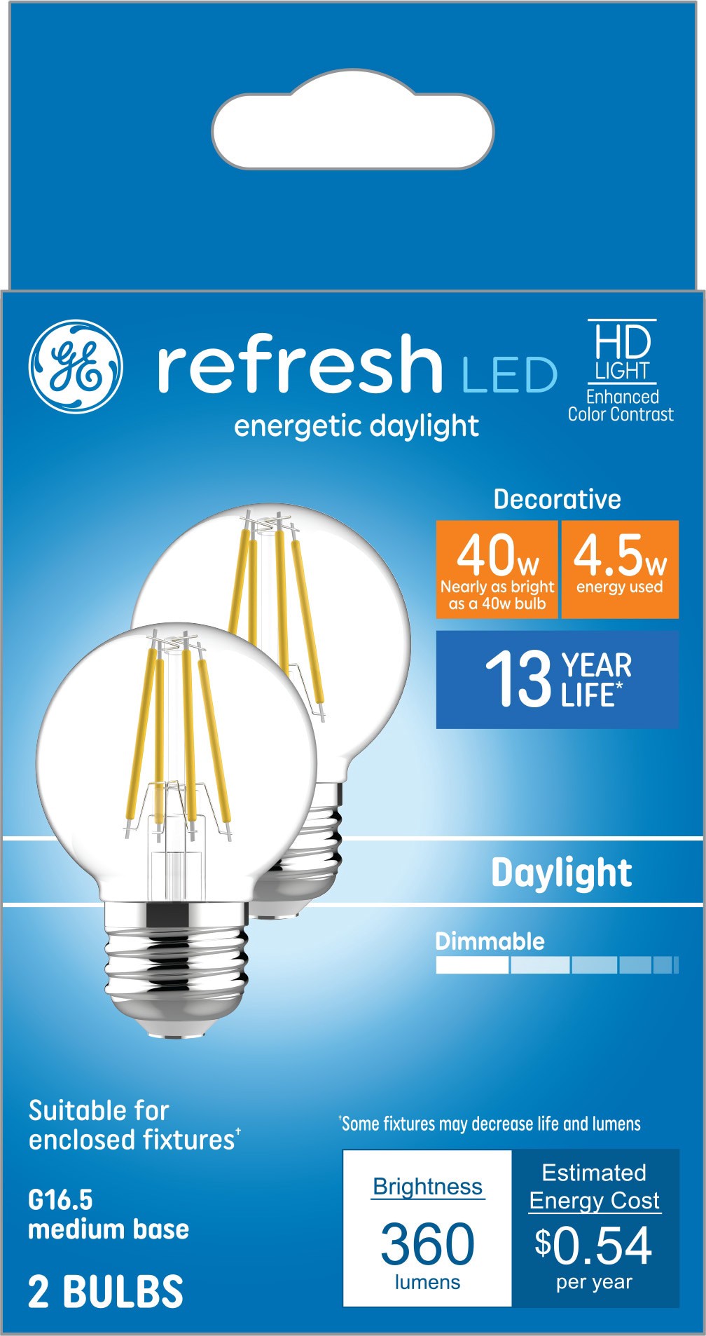 GE 40 -Watt EQ G16.5 Daylight Medium screw base E26 Dimmable LED Decorative Light Bulb 2 -Pack