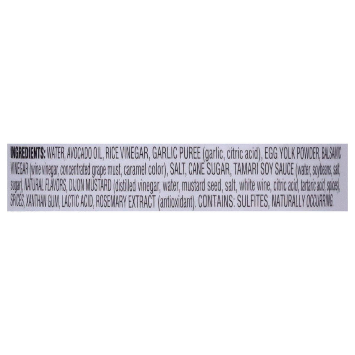Water, Avocado Oil, Rice Vinegar, Garlic Puree (Garlic, Citric Acid), Egg Yolk Powder, Balsamic Vinegar (Wine Vinegar, Concentrated Grape Must, Caramel Color), Salt, Cane Sugar, Tamari Soy Sauce (Wate…
