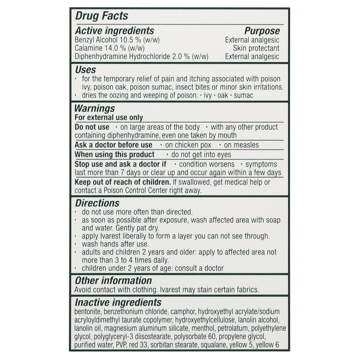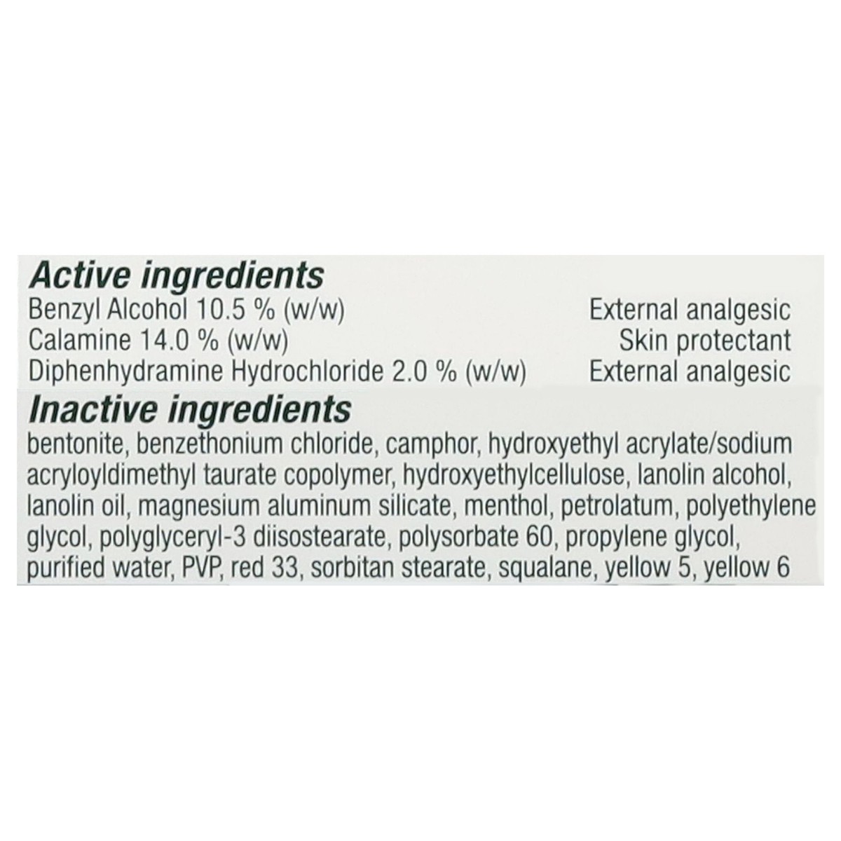 Active Ingredients: Benzyl Alcohol (w/w) (10.5 %), External Analgesic; Calamine (w/w) (14.0 %), Skin Protectant; Diphenhydramine Hydrochloride (w/w) (2.0 %), External Analgesic. Inactive Ingredients: …