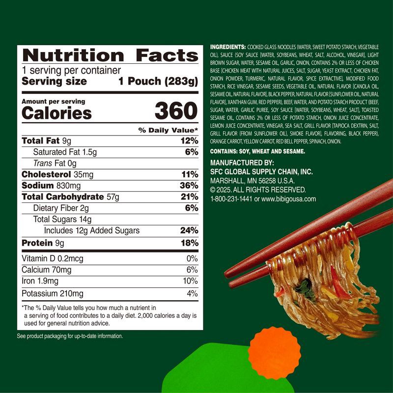 COOKED GLASS NOODLES (WATER, SWEET POTATO STARCH, VEGETABLE OIL), SAUCE (SOY SAUCE [WATER, SOYBEANS, WHEAT, SALT, ALCOHOL, VINEGAR], LIGHT BROWN SUGAR, WATER, SESAME OIL, GARLIC, ONION, CONTAINS 2% OR…