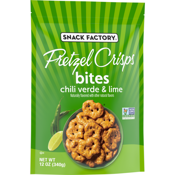 Get a taste of Chili Verde & Lime Snack Factory Pretzel Crisps Bites. Thin pretzels with a crispy crunch, coated in the perfect amount of seasoning. Snack Factory Pretzel Crisps are bite-sized, incred…