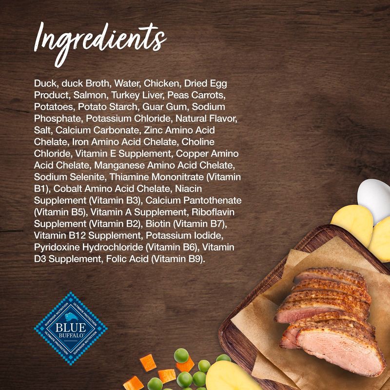 Duck, Duck Broth, Water, Chicken, Dried Egg Product, Salmon, Turkey Liver, Peas, Carrots, Potatoes, Potato Starch, Guar Gum, Sodium Phosphate, Potassium Chloride, Natural Flavor, Salt, Calcium Carbona…