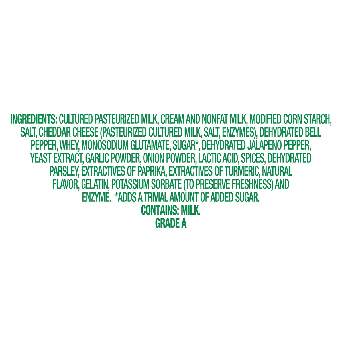 Cultured Pasteurized Milk, Cream and Nonfat Milk, Modified Corn Starch, Salt, Whey, Dehydrated Bell, Pepper, Monosodium Glutamate, Dehydrated Jalapeno Pepper, Sugar, Lactic Acid, Natural Flavors, Auto…