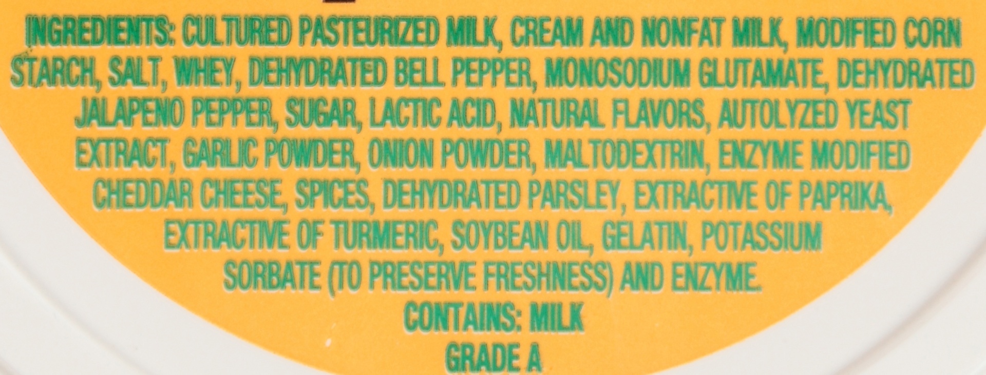 Cultured Pasteurized Milk, Cream and Nonfat Milk, Salt, Less than 2% of: Cheddar Cheese (Pasteurized Cultured Milk, Salt, Enzymes), Bell Pepper*, Modified Corn Starch, Whey, Monosodium Glutamate, Suga…