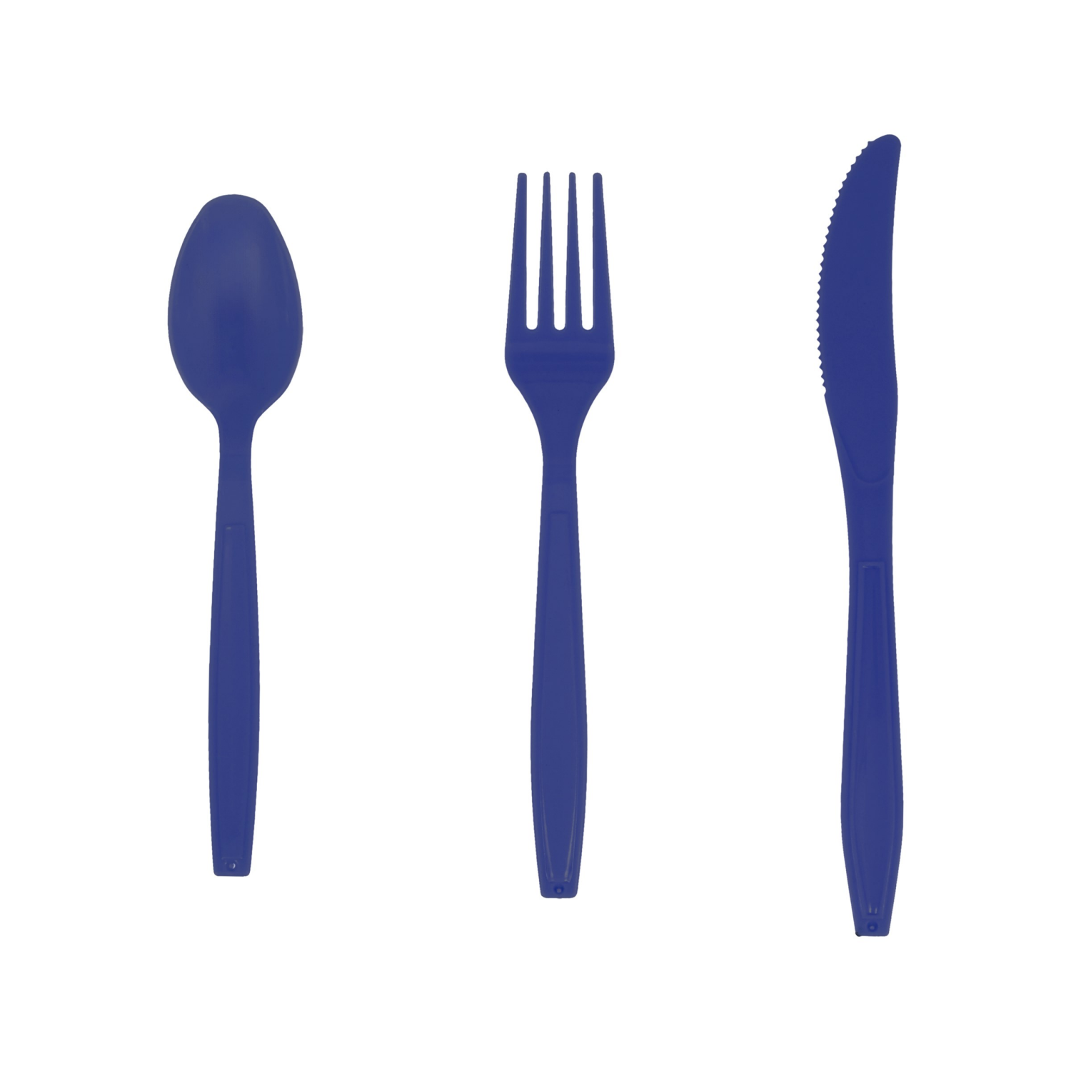 Make party prep easy with this 18 pack of navy blue plastic cutlery. With 6 forks, 6 knives, and 6 spoons, it's just what you need for serving up party snacks, cake, and more.