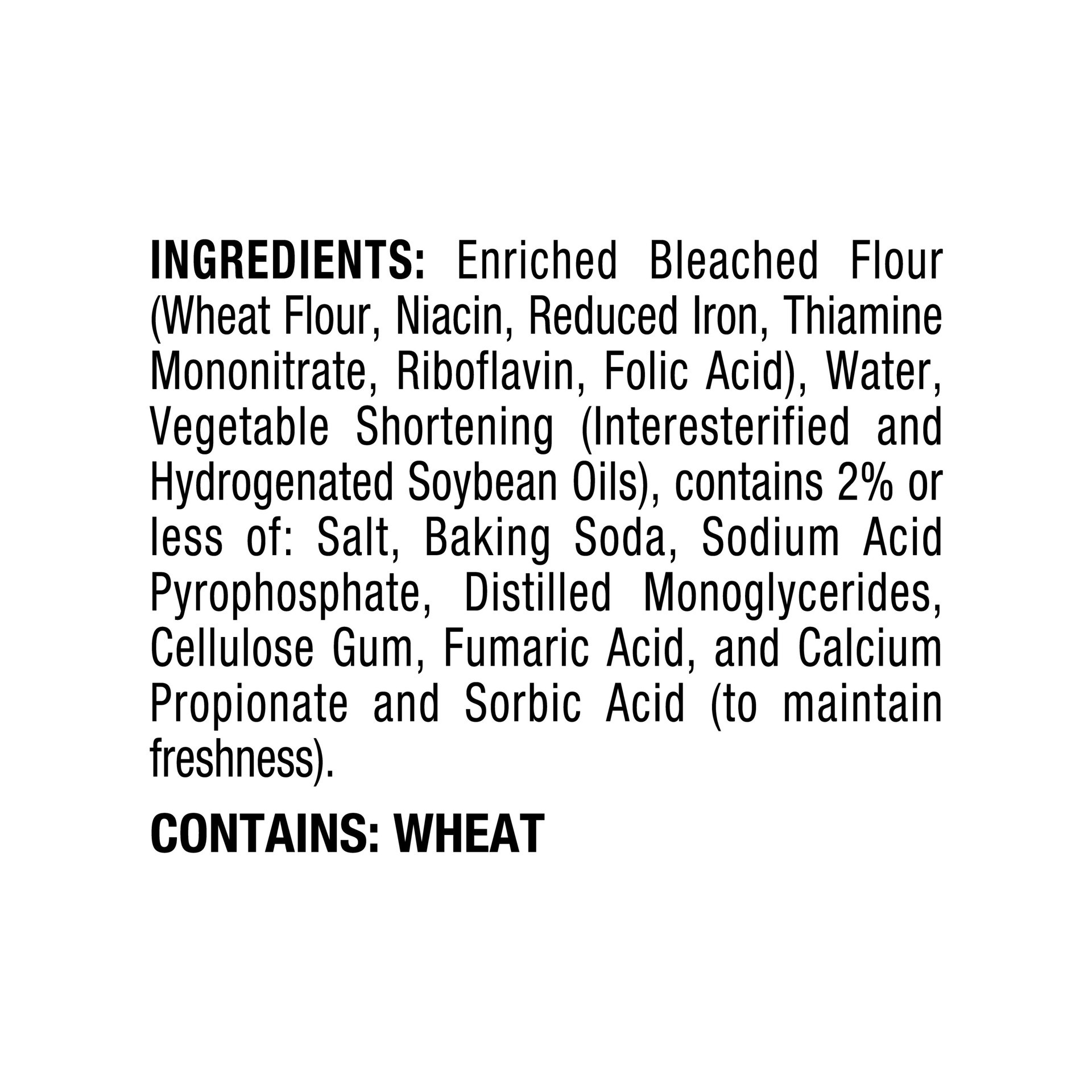Enriched Bleached Flour (Wheat Flour, Niacin, Reduced Iron, Thiamine Mononitrate, Riboflavin, Folic Acid), Water, Vegetable Shortening (Interesterified and Hydrogenated Soybean Oils), Contains 2% or L…