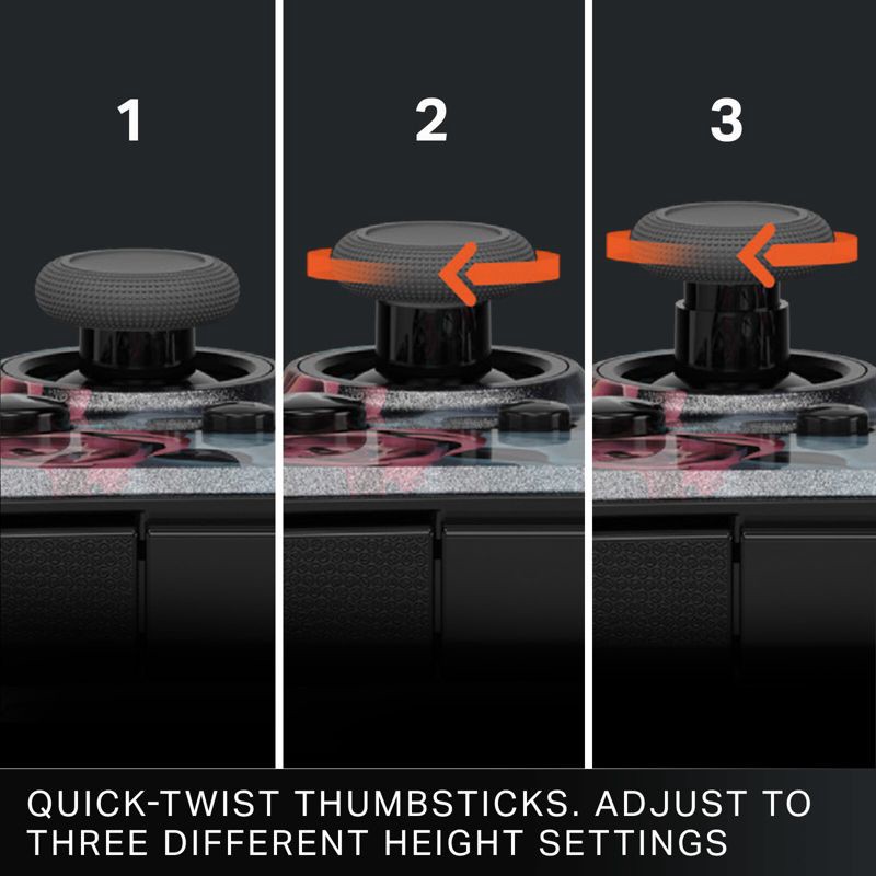 - Quick-Twist Thumbsticks – Easily adjust the height for each thumbstick in the middle of a game with a simple twist: no need to swap out parts. 3 Height settings: Standard, Medium, Tall.