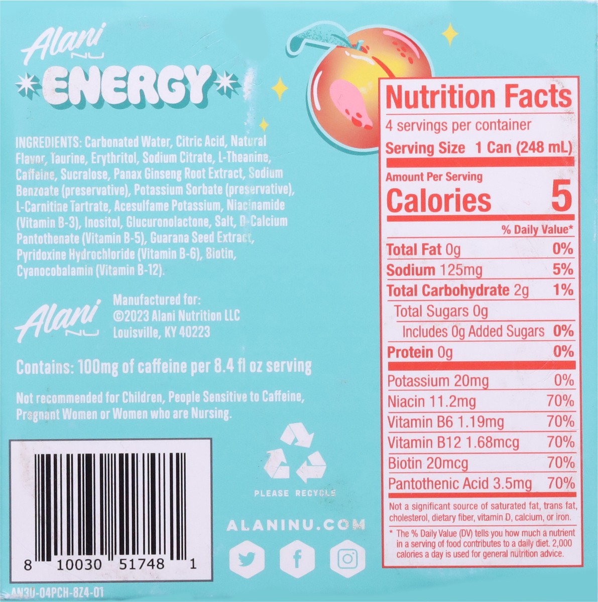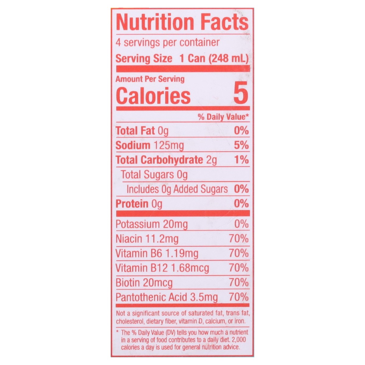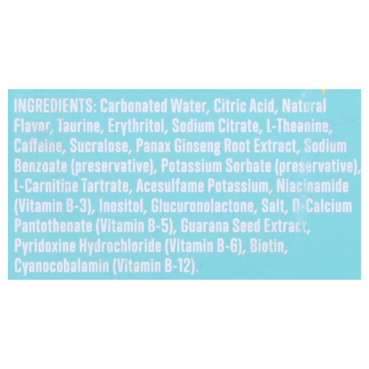 Carbonated Water, Citric Acid, Taurine, Sodium Citrate, L-Theanine, Caffeine, Sucralose, Sodium Benzoate (Preservative), Potassium Sorbate (Preservative), L-Carnitine L-Tartrate, Panax Ginseng Root Ex…