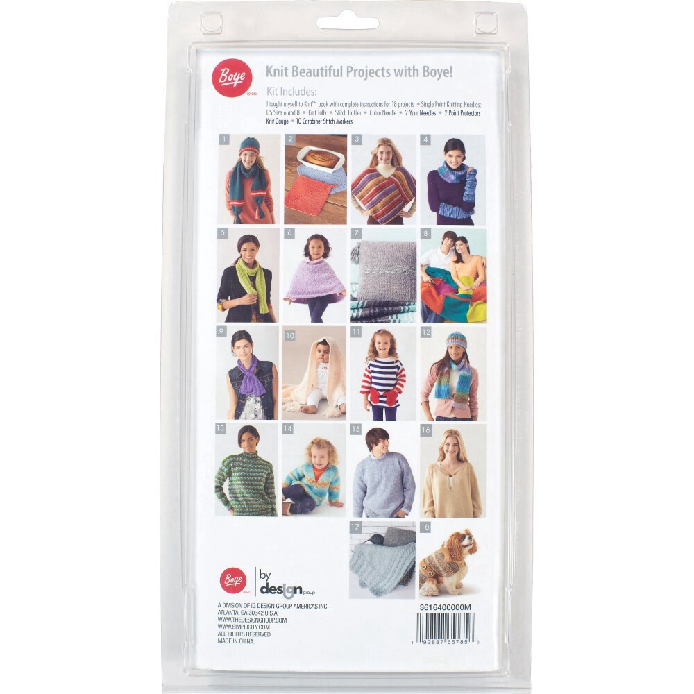 Kit includes Instruction book with 18 projects, Single point knitting needles US size 6 and 8, Knit tally, Stich holder, Cable needle, 2 Yarn needles, 2 Point protectors, Knit gauge an 10 Carabiner St…