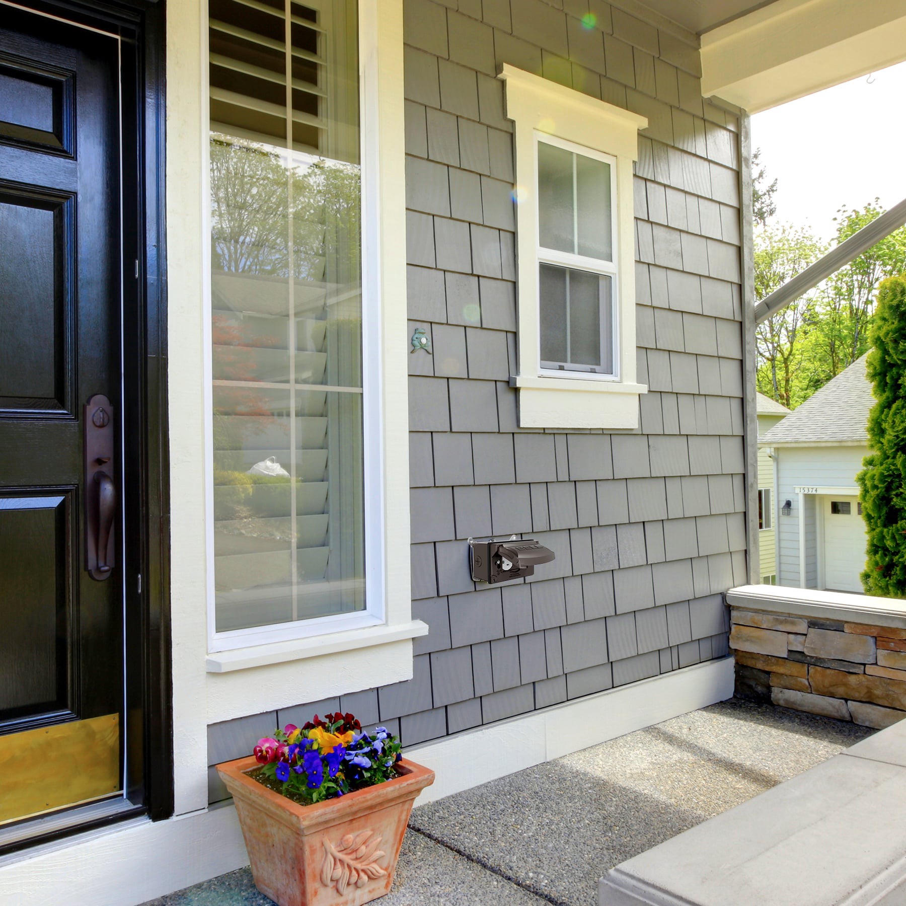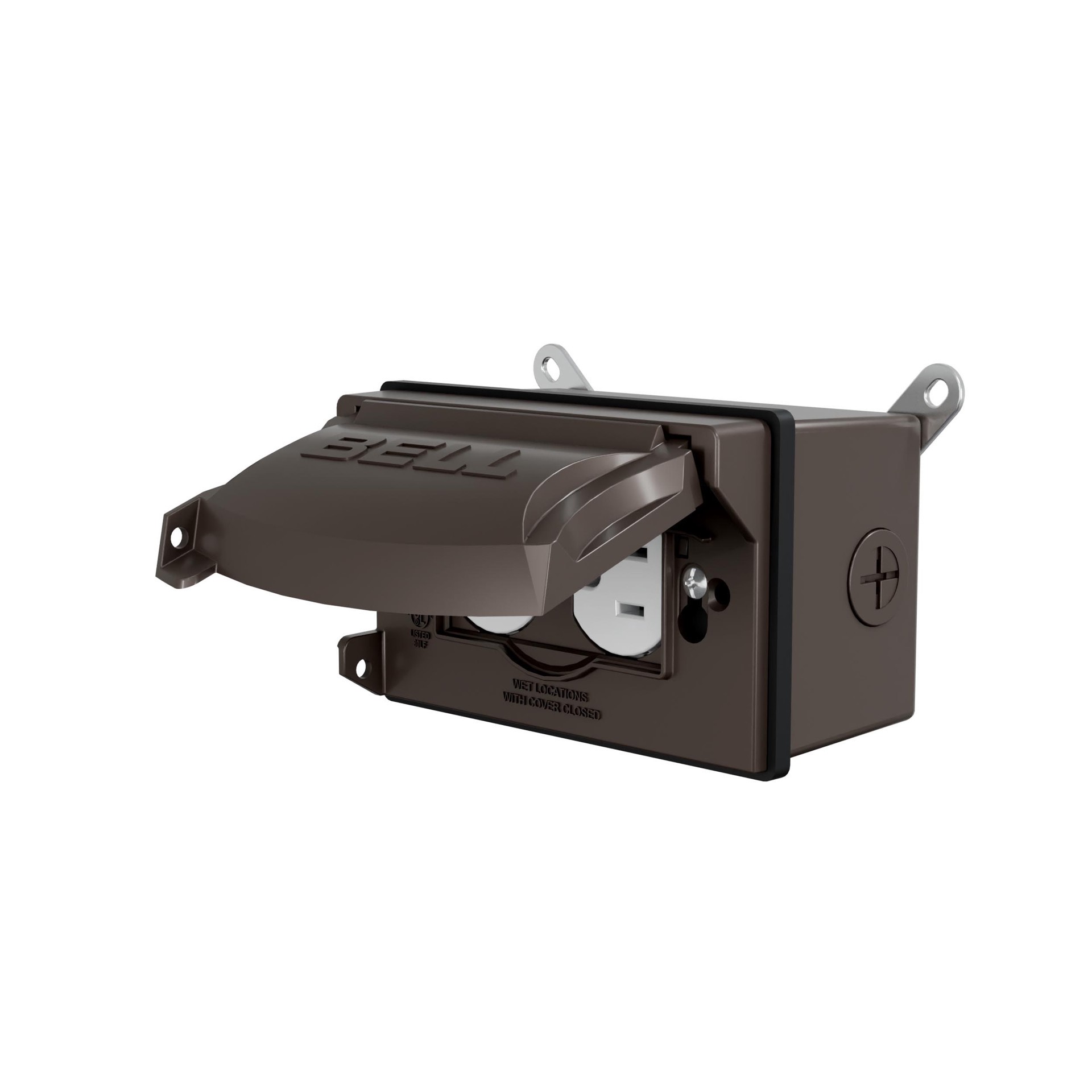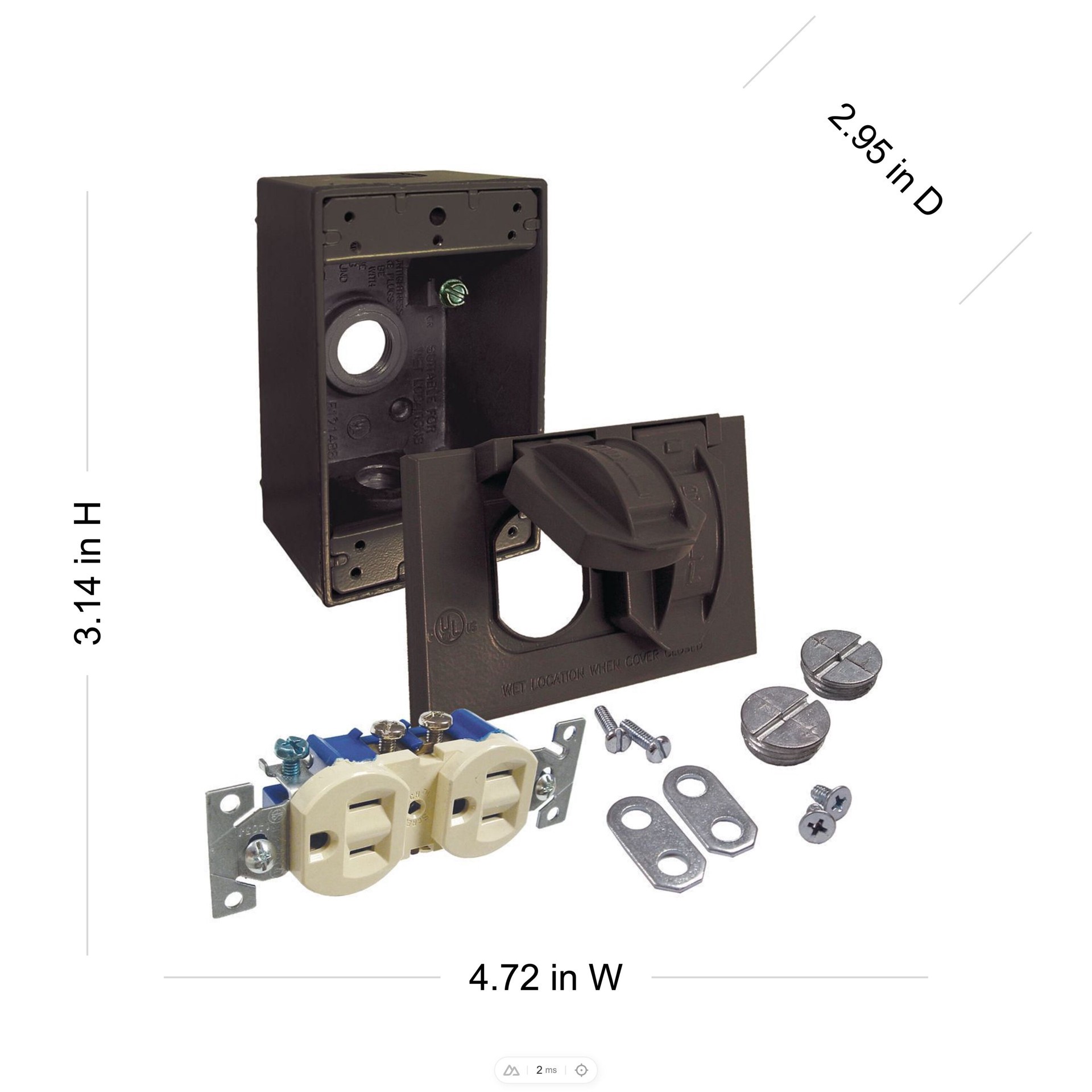 Rugged die-cast construction. Self-closing lids assure weatherproof protection. Includes flip cover, 15A WR/TR Duplex receptacle, and an outlet box with three 1/2 in threaded outlets. NEMA 3R rated. c…