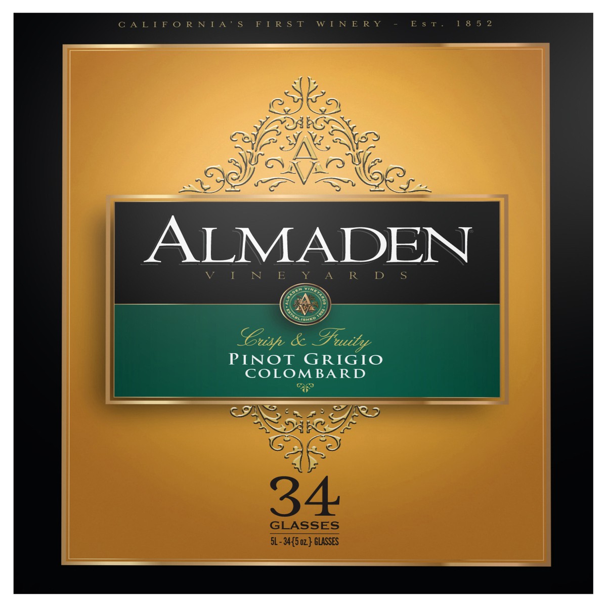 - One 5L box of Almaden Pinot Grigio white wineAlmaden Pinot Grigio white wine has aromas of tropical fruit and lemon zest. Crisp, refreshing and full-flavored. Flavors of peach, pear and rich mineral notes.Light-bodied white wine with tropical fruit and lemon zest aromasPairs well with seafood pasta12% alcohol by volume (ABV)