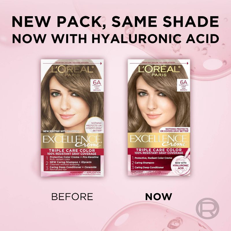 - Your Excellence Just Got Better: New Triple Care Color Routine infused with Hyaluronic Acid protects hair before, during, and after coloring for up to 8 weeks with a combination of ceramide, pro-keratine, and glycerin for rich color and revitalized hair. New look same great shades