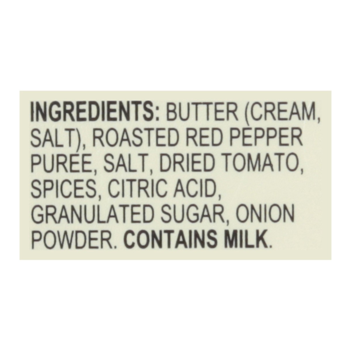 Butter (Cream, Salt), Roasted Red Pepper Puree, Salt, Dried Tomato, Spices, Citric Acid, Granulated Sugar, Onion Powder.