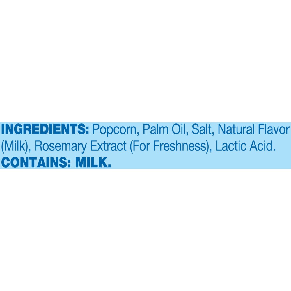 INGREDIENTS: POPCORN, PALM OIL, SALT, NATURAL FLAVOR (MILK), ROSEMARY EXTRACT (FOR FRESHNESS), LACTIC ACID. CONTAINS: MILK